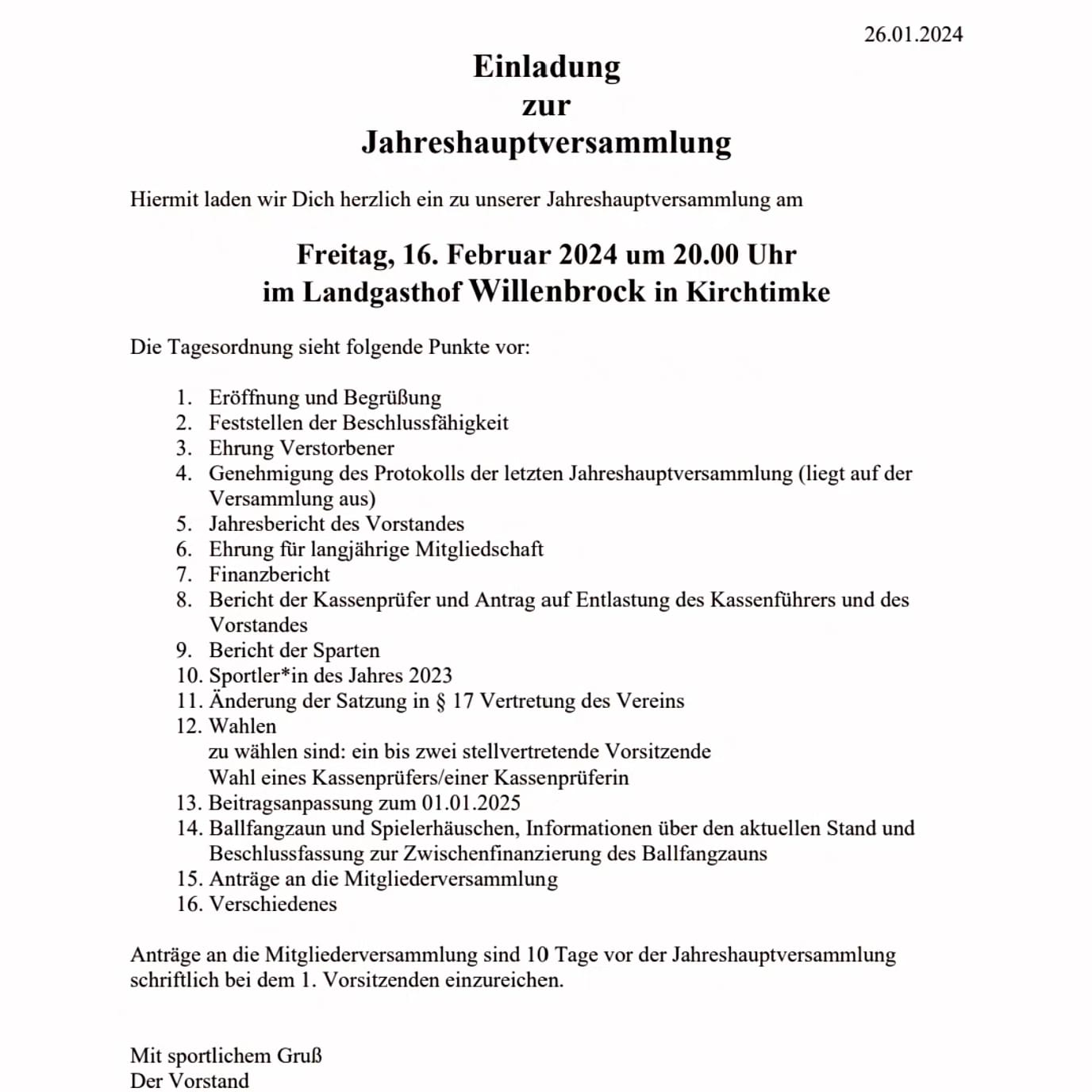 Wir laden alle Mitglieder des TSV Timke zur diesjährigen Jahreshauptversammlaung ein. Auf der Agenda stehen nehmen den Ehrungen, der Wahl zum Sportler bzw. zur Sportlerin des Jahres auch Wahlen des Vorstands. Wir haben Lust auf frischen Wind und wenn du mit uns den Verein aufwirbeln willst, dann melde dich bei uns!